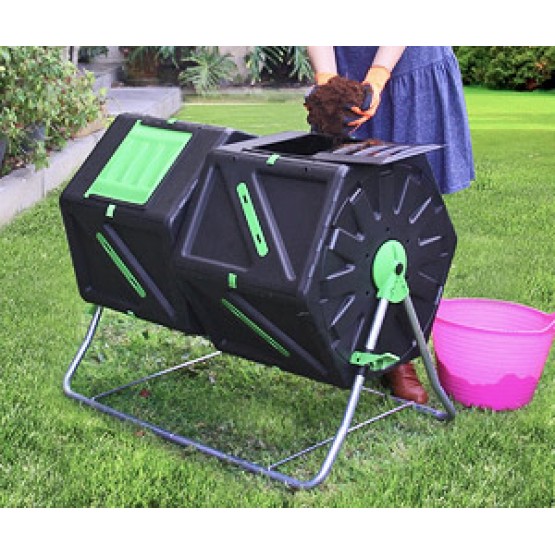 Draai om de 2 - 3 dagen een tiental rotaties om het compostproces te versnellen. Na 4-6 weken hebt u reeds compost van uitstekende kwaliteit, in vergelijking met de 10 weken voor een gewoon compostvat. Door een intern verluchtingssysteem in de twee vaten wordt het proces versneld, de zuurstof circuleert en kwalijke geurtjes verdwijnen. De stalen structuur en de vorm van de twee vaten oogt daarenboven harmonieus. De zwarte kleur slorpt ook de warmte op, wat ook het proces versnelt.